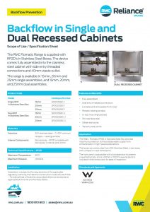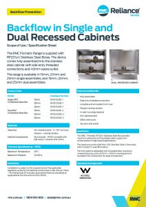 The RMC Flomatic Range is supplied with RPZD’s in Stainless Steel Boxes. The device comes fully assembled into the stainless steel cabinet with side entry threaded connections and 40mm waste outlet.